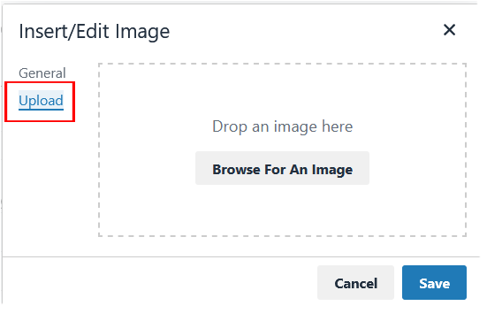 To add an image, click Upload. Drag and drop the image from your computer onto the box or browse your computer for the image file. Click Save.