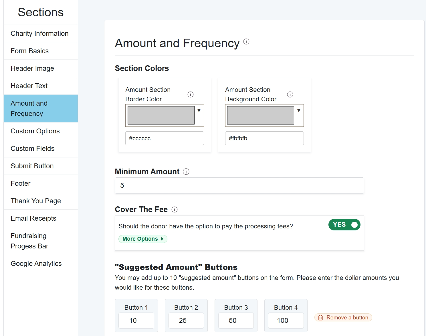 This section is set up with four standard amount buttons (your form will automatically include an "Other" amount button.) You may add additional buttons (up to 10) or delete extra buttons (down to one).