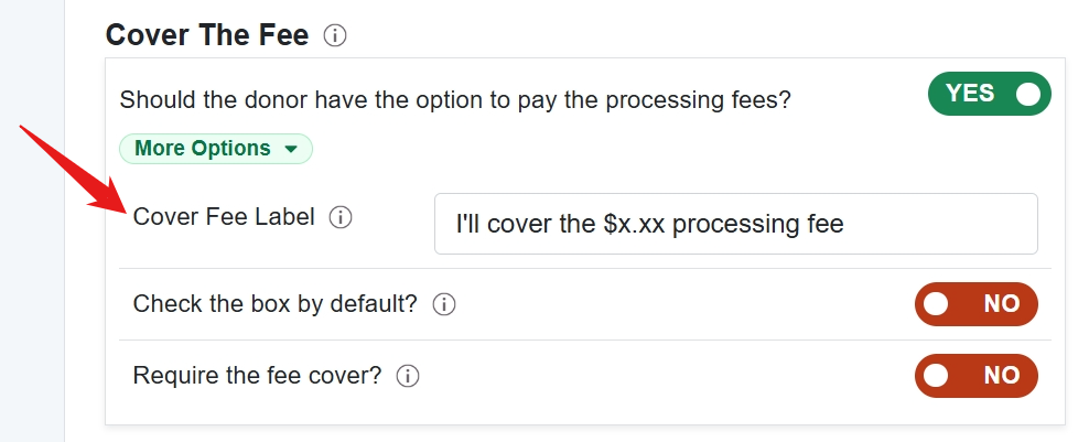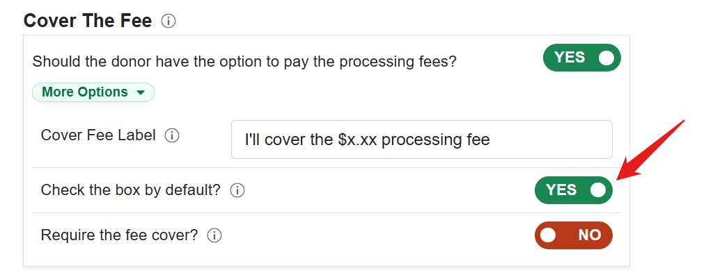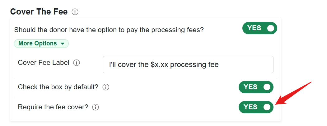 - Require Cover Fee: You can make the cover fee required by changing the toggle to Yes. Making the cover fee required will remove the checkbox on the fundraising form and the donor will not have the option to opt-out.
