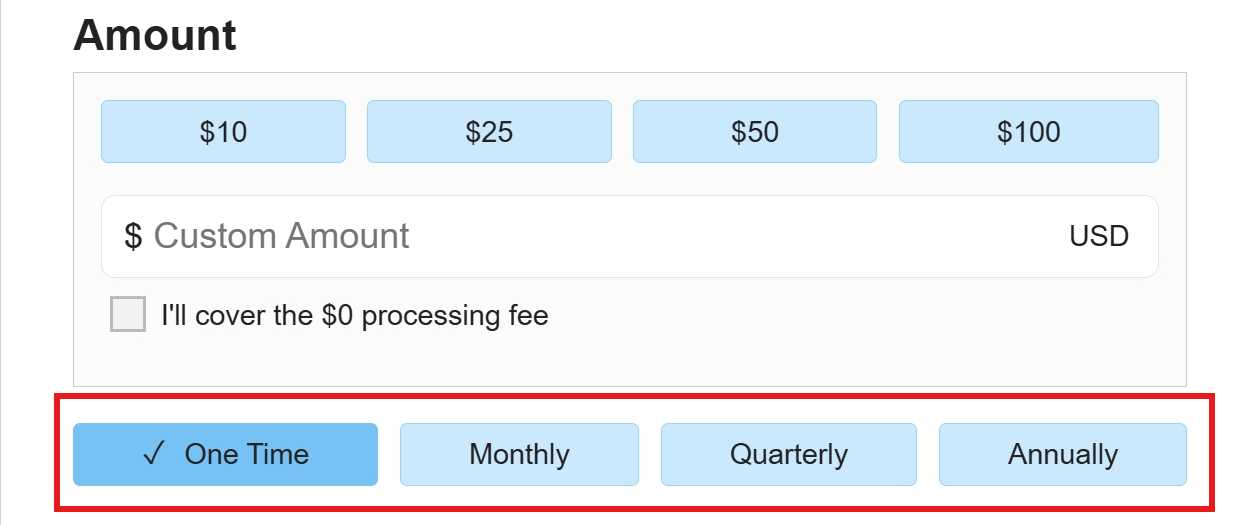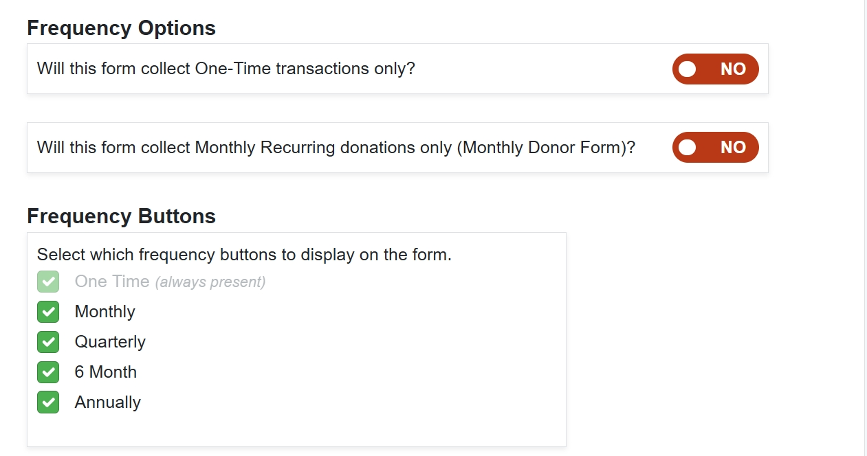 You can also have the form be only one-time transactions or only monthly donations. If either of these are toggled to yes, the frequency buttons will not be displayed on the form.