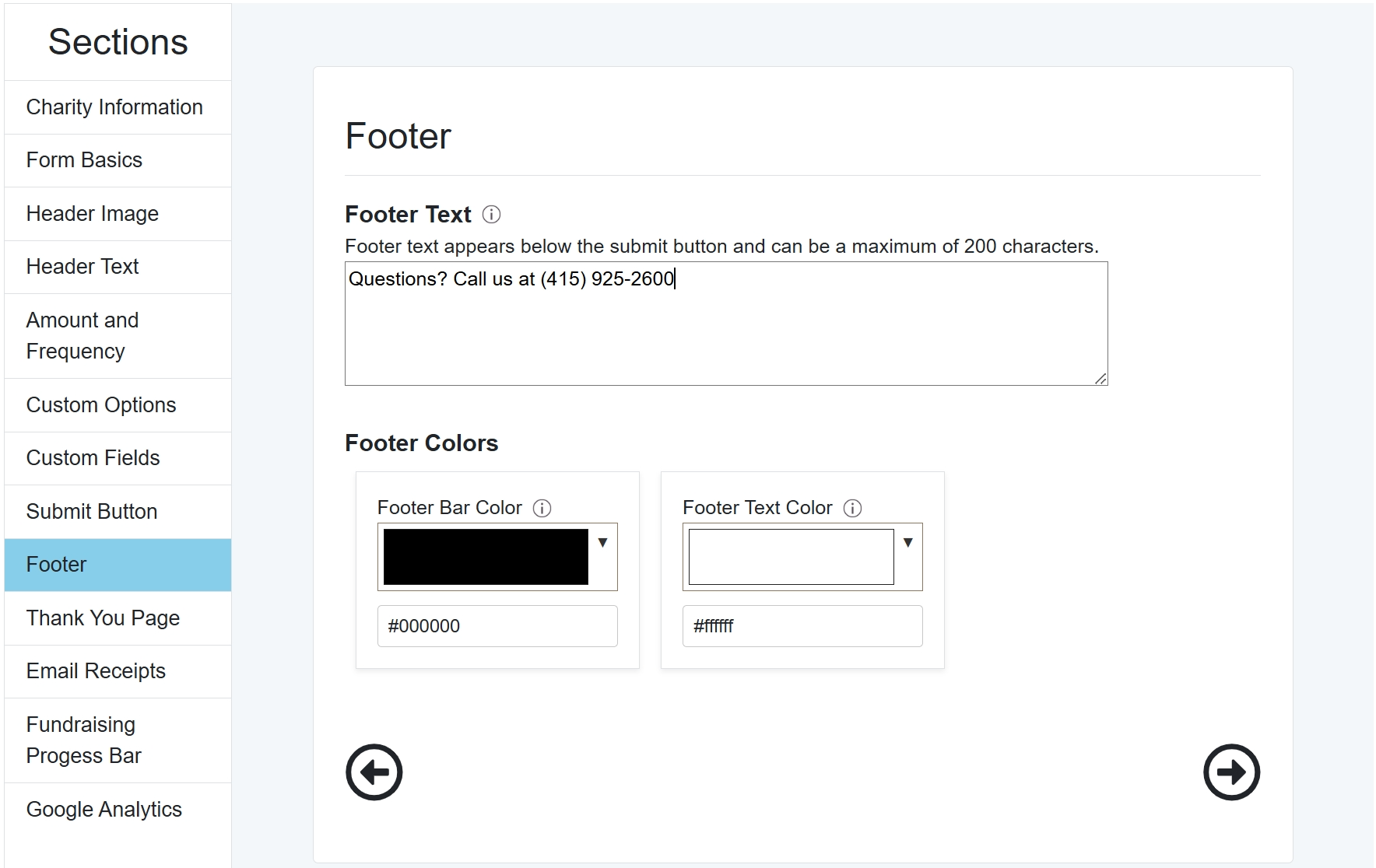 Adding text here does not change the charity contact information listed in the colored part of the footer.