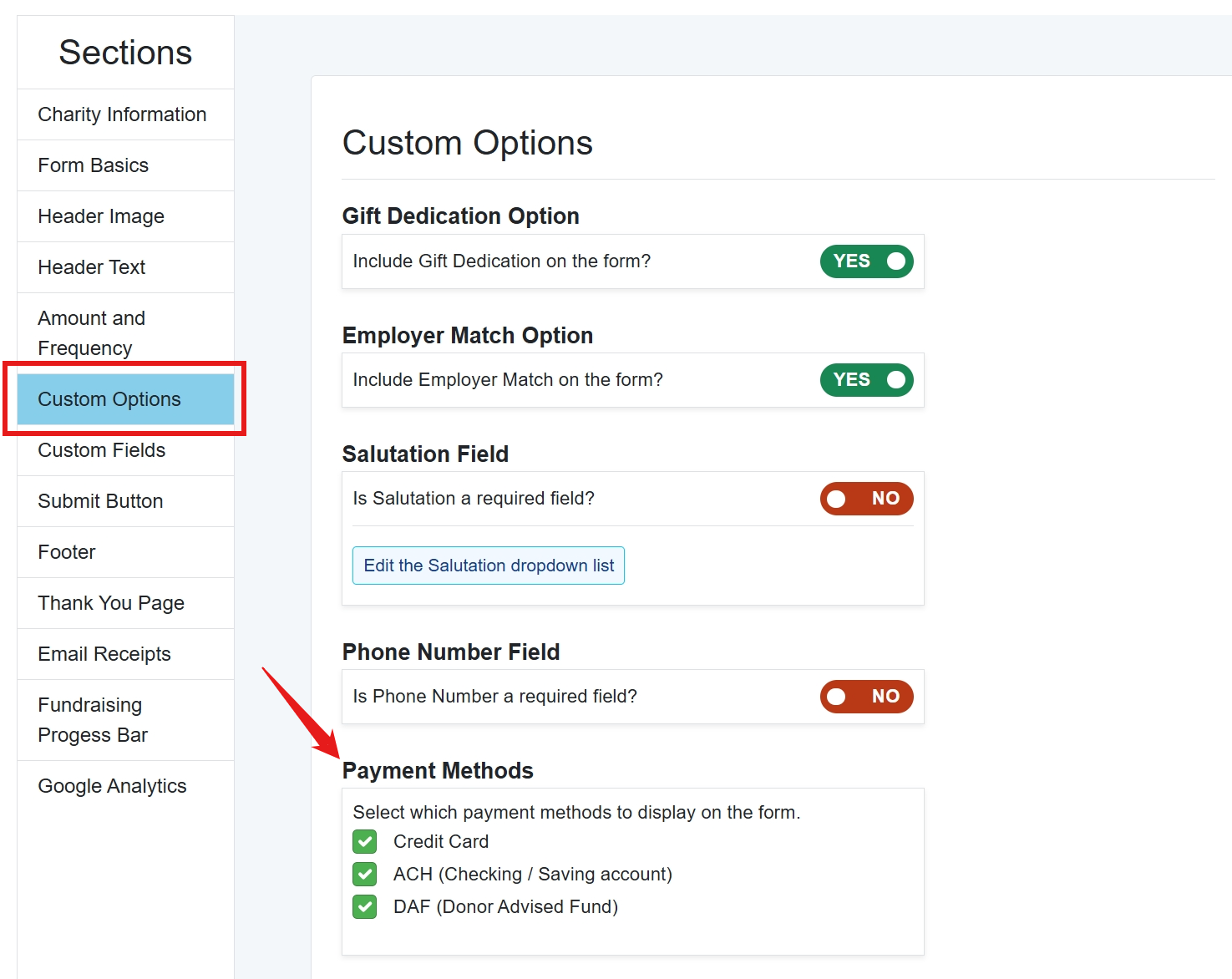 To edit your payment methods, log into the GiveDirect portal, and go to the Form Builder for the form you wish to edit. Go to the Custom Options section. From there, you can select or deselect the payment methods. Once you have made your selections, be sure to Save your changes.