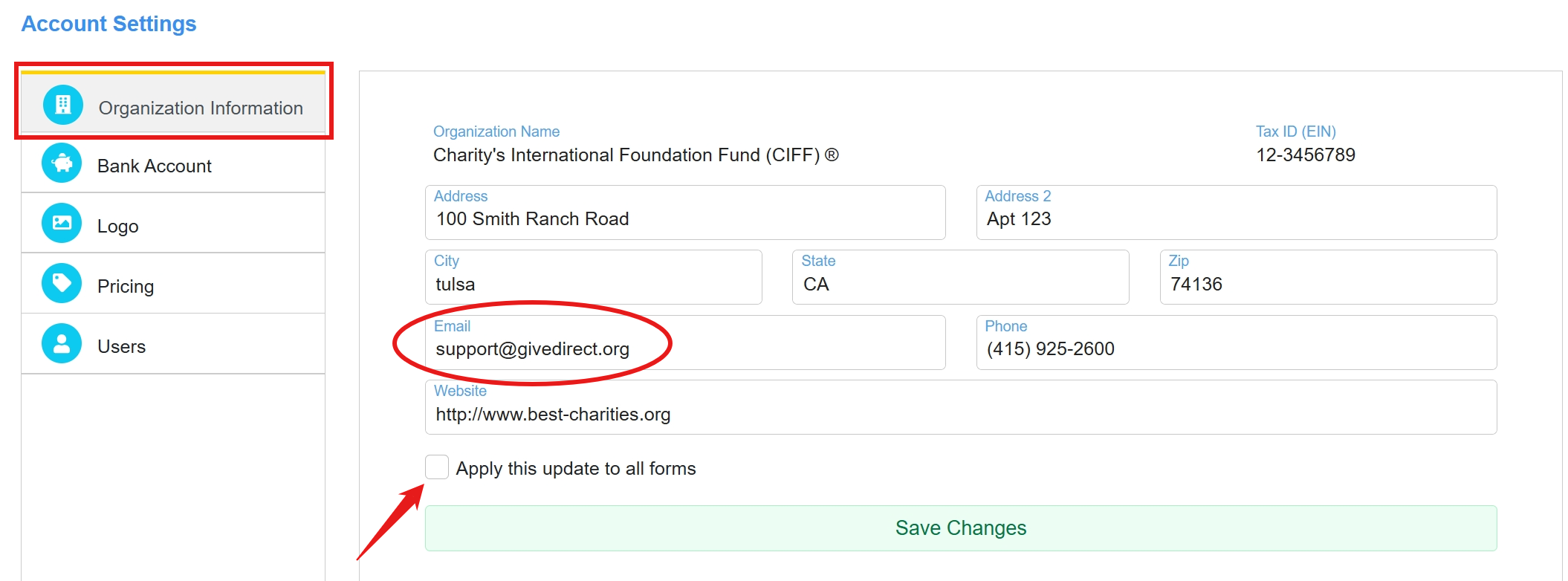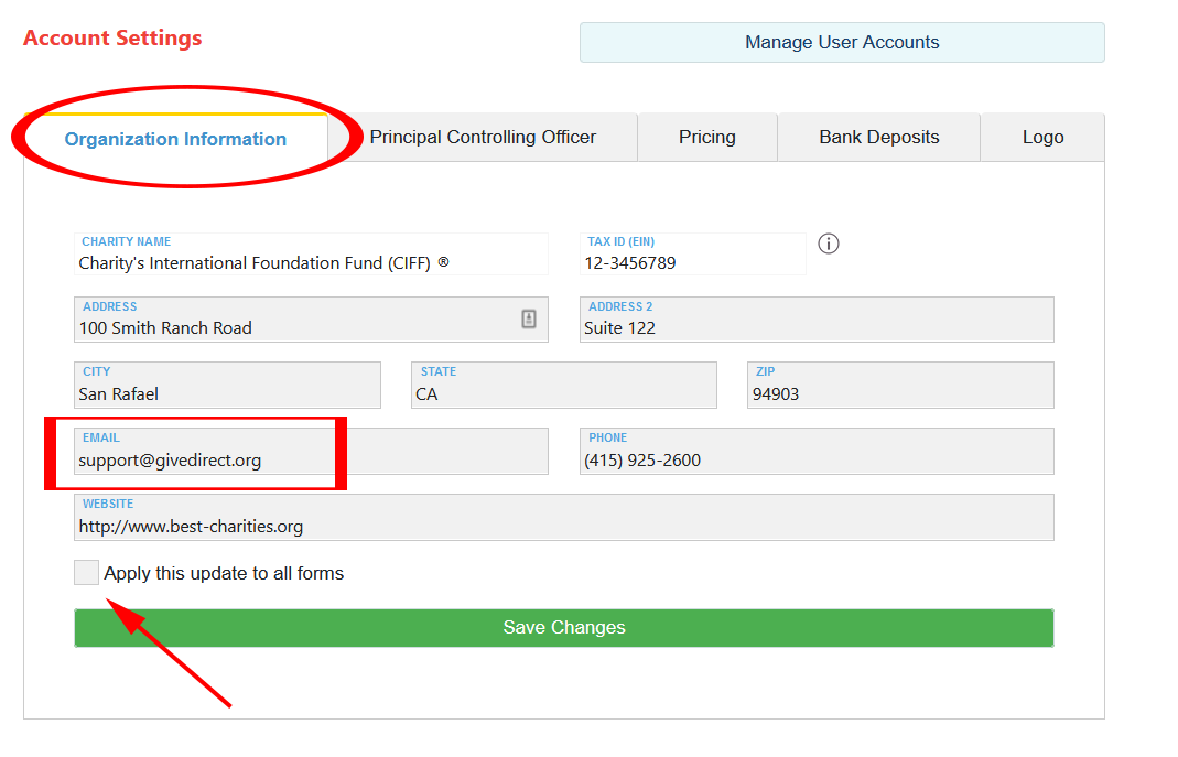 Step 2: Go to the Organization Information tab and update the email address. If this change should be applied to all fundraising forms, click the check box and save your changes.