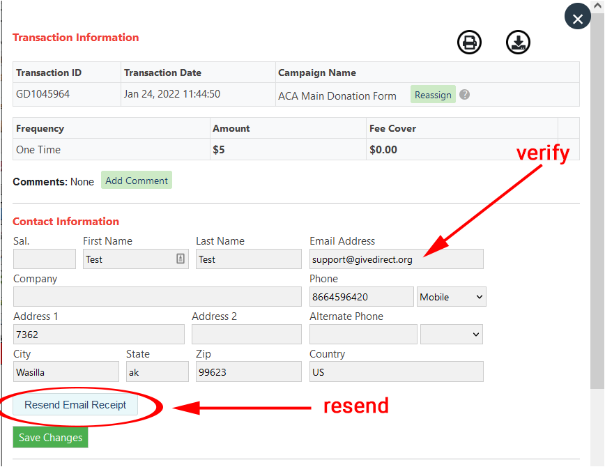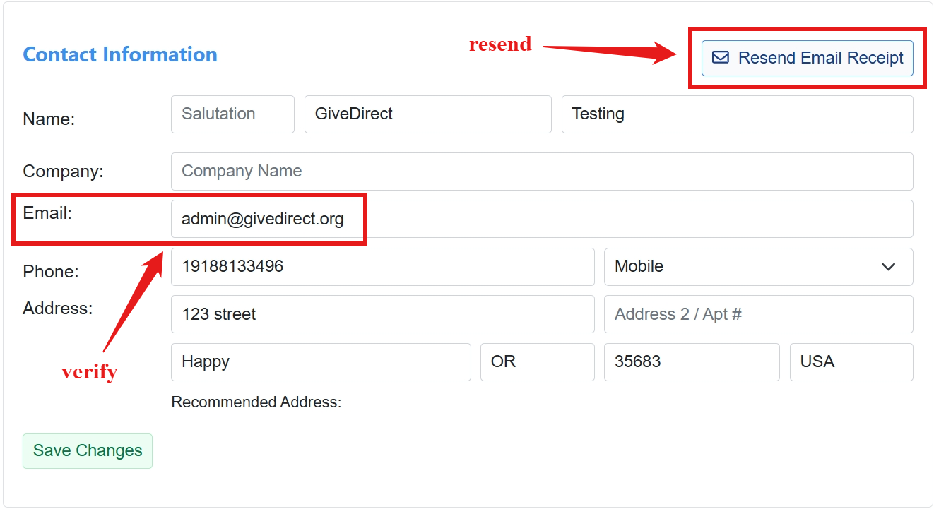 A donor's email receipt will be sent from receipt@email.givedirect.org.