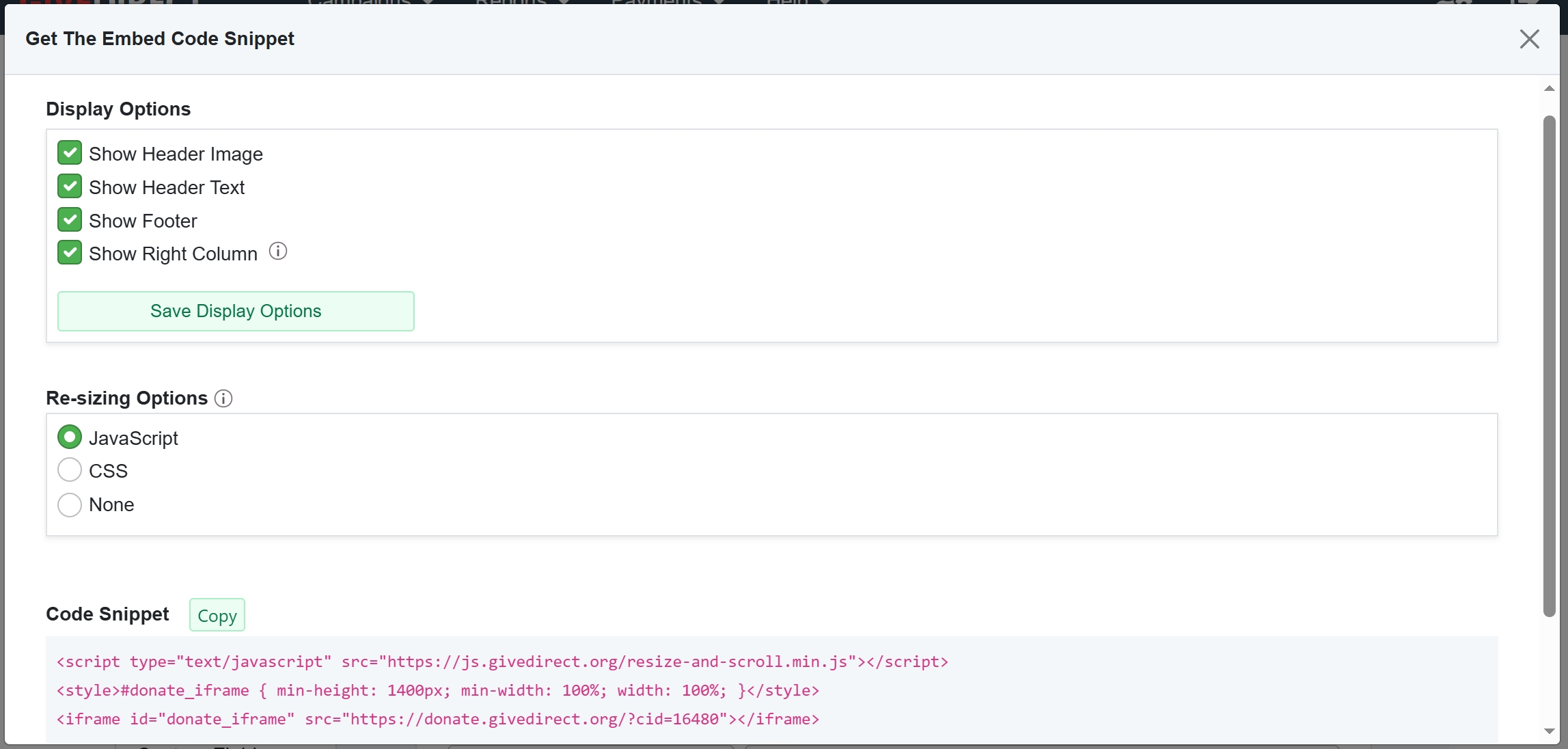 If you are embedding your form, determine which display options you will use and then copy the code snippet.