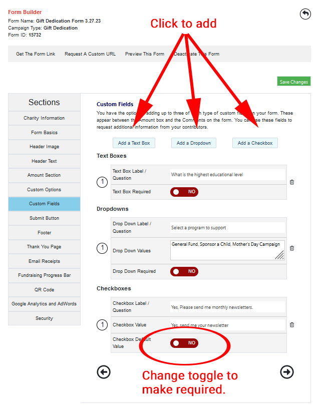 Custom fields can be required (toggle to YES) or optional (toggle to NO).