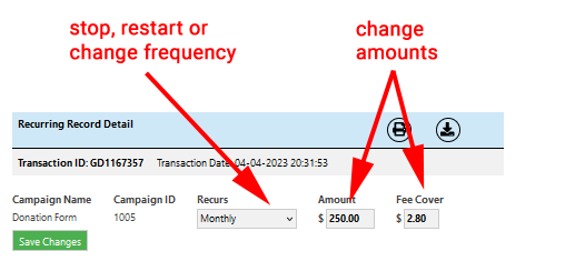 In this section you may stop, restart, or change the frequency of the payment. You may also change the amount or fee cover amount.