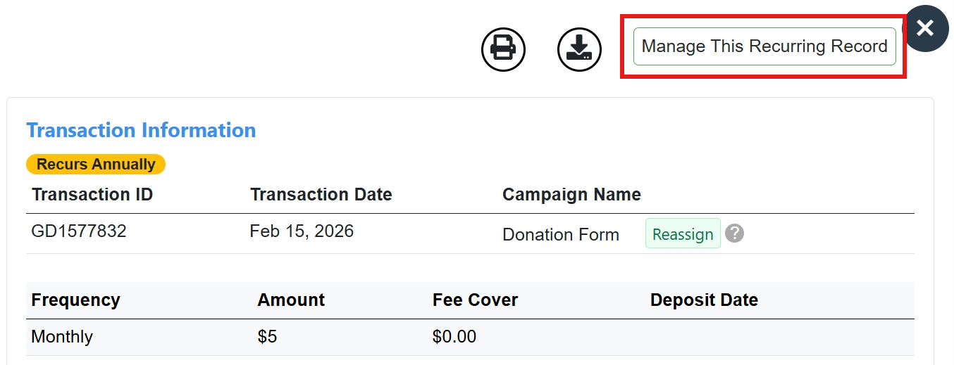 - Click "Manage This Recurring Record" in one of the donor's transaction details.