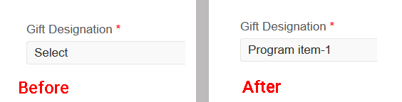 Without using the pre-population method as described, your donation form will read "Select" in the dropdown menu field (as seen in the before graphic, figure 3). If you pre-populate your form with a gift designation, the dropdown menu field will already have your program selection.